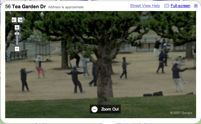 Das Schöne am Tai Chi Chuan ist, dass man es überall praktizieren kann, ohne Geräte zu benötigen. Manche üben auch im Park wie die Gruppe, die Googles Street View-Kamera in einem Park am Tea Garden Drive in San Francisco eingefangen hat: